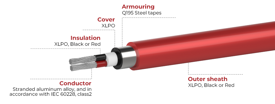 Gepanzertes Kabel, Klasse 2, 35 mm², zweiadrig, TÜV 2PfG/2642, 1500 V DC, Aluminiumkern, direkt vergrabener Draht