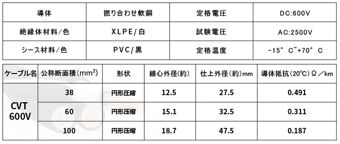 CVT-Kabel (Abkürzung für „Cross-Linked Polyethylen Insulated Vinyl Sheathed Cables“) sind JIS-Standardprodukte, bei denen es sich um einadrige CV-Kabel handelt, die zu Stromkabeln verseilt sind und für die Übertragung und Verteilung der gesamten elektrischen Energie aus Niederspannung verwendet werden auf Hochspannung.