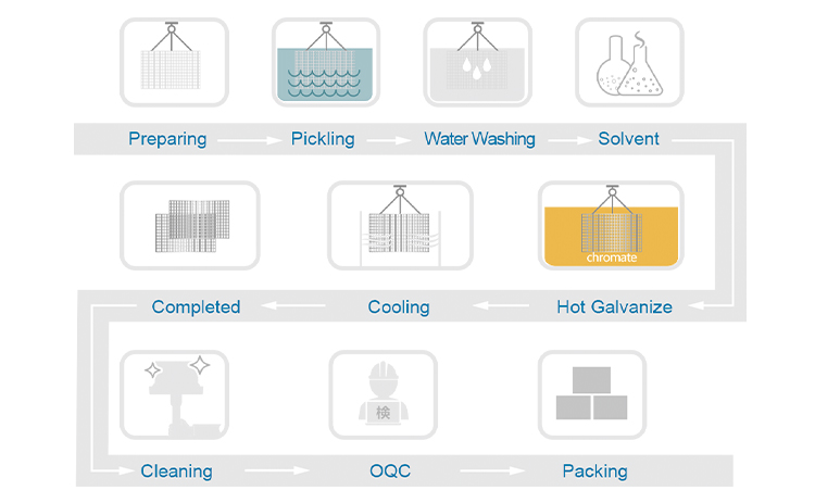Feuerverzinkung ist eine Art der Rostschutzbehandlung von Stahlwerkstoffen, und es ist eine Technologie, die die Korrosionsbeständigkeit von Stahlwerkstoffen unterdrückt, indem Stahlwerkstoff in Zink eingetaucht wird, das bei einer hohen Temperatur von 50 ° C gelöst ist, und eine Zinklegierungsschicht auf der Oberfläche bildet des Stahlmaterials durch Verzicht auf die Korrosionsschutzwirkung von Zink. Es wird häufig als Korrosionsschutzbehandlung für im Freien installierte Stahlkonstruktionen verwendet.