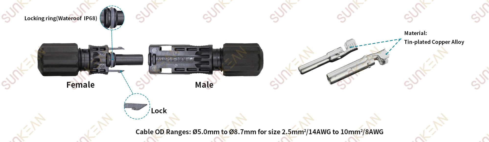 der h4 plus stecker bereitgestellt von SUNKEAN ist ein robuster, doppelt zertifizierter DC-Steckverbinder mit UL 6703 1500 V und IEC 62852 (ed.1); am 1 1500 V (Klasse A) Spezifikationen und Zertifizierungen. als Weiterentwicklung des H4-Steckverbinders, der H4-Plus-Steckverbinder zeichnet sich durch hervorragende Haltbarkeit aus, Amphenol-kompatible Steckkonfiguration, Amphenols niederohmige RADSOK®-Kontakttechnologie, Fähigkeit, Drahtstärken von 14 AWG/2.5 mm² bis 8 AWG/10 mm², und eine IP68-Einstufung. zu akzeptieren. Verbesserungen gegenüber dem H4, die in den H4-Plus-Steckverbindern enthalten sind, sind eine Gegenmutter mit Sperrklinke,, die ein einmaliges Durchdrehen verhindert die Mutter wird angezogen, eine verbesserte Dichtungstülle für noch bessere Nassleckageleistung, und optimiertes Kontaktdesign für hervorragende Langzeitstabilität. durch Verwendung von Stopfbuchsenmuttern, umweltfreundliche Dichtungen, Spannzangen für Draht 3 und Kontakte, die mehrere Drahtstärken akzeptieren,, die Anzahl der Teile reduziert und echte Kosteneinsparungen generiert werden.