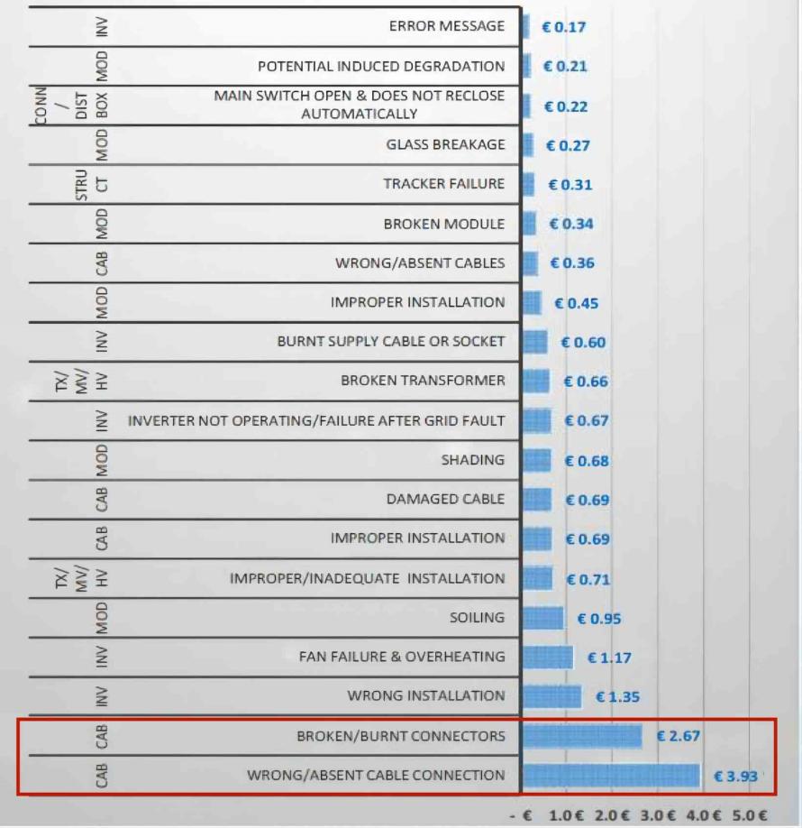 Der vom Projektteam „Solar Bankability“ des EU-Programms Horizon2020 veröffentlichte Bericht zeigt, dass bei den durch technische Ausfälle von TOP20 verursachten Einnahmenausfällen von Kraftwerken gebrochene und durchgebrannte Steckverbinder auf Platz 2 rangieren und die falsche/fehlende Kabelverbindung an 1. Stelle steht.