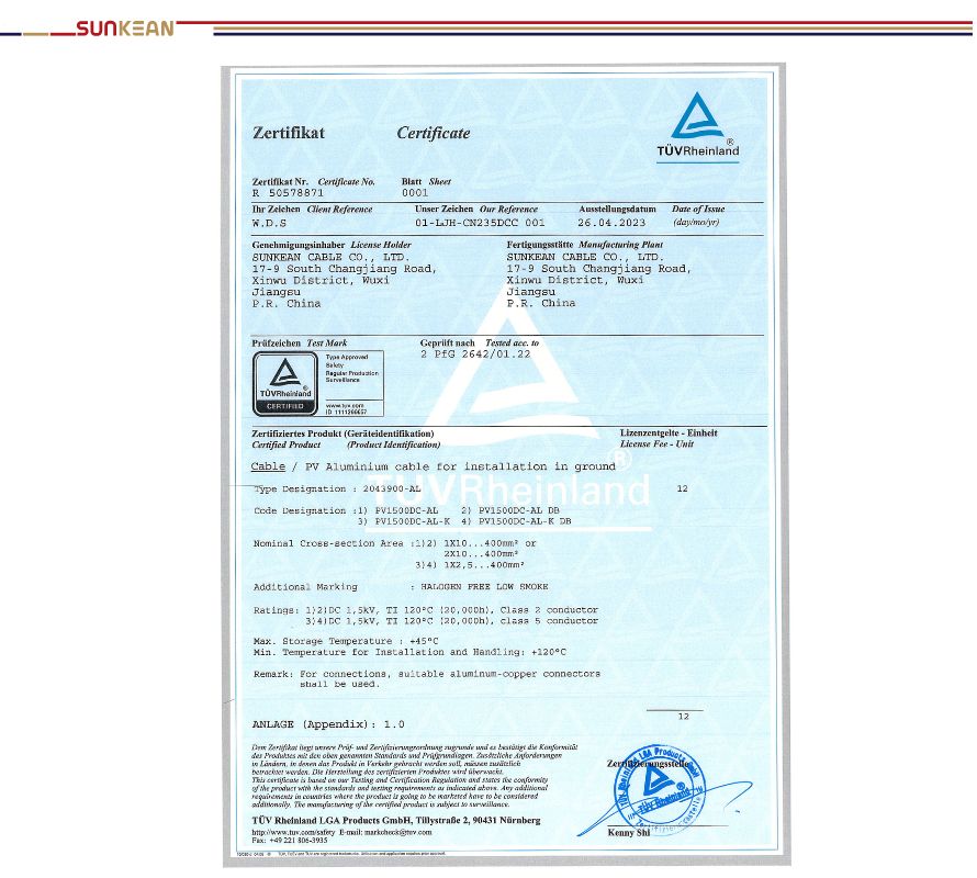 Wir freuen uns, Ihnen mitteilen zu können, dass der Aluminium-PV-Draht von SUNKEAN kürzlich einen wichtigen Meilenstein erreicht hat, indem er die TÜV-Zertifizierung erhalten hat: 2 PfG 2642. Diese Zertifizierung bestätigt die hohe Qualität und Zuverlässigkeit unseres Produkts weiter und bietet unseren Kunden eine verbesserte Solarlösung.