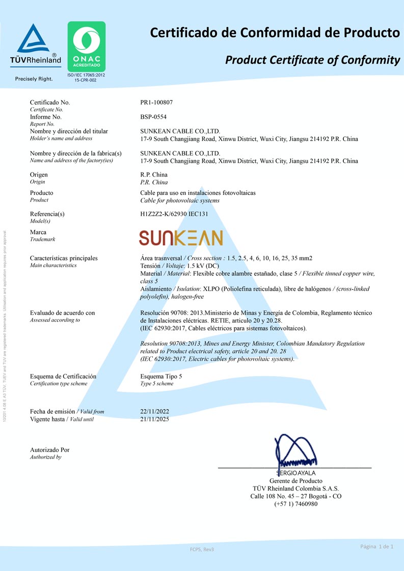 SUNKEAN gibt heute bekannt, dass das Unternehmen die kolumbianische RETIE-Zertifizierung für seine Solarkabeltypen H1Z2Z2-K/62930 IEC131 erhalten hat. Dieses Zertifikat umfasst 1,5 ~ 35 mm 2 H1Z2Z2-K/62930 IEC131 Solarkabel.