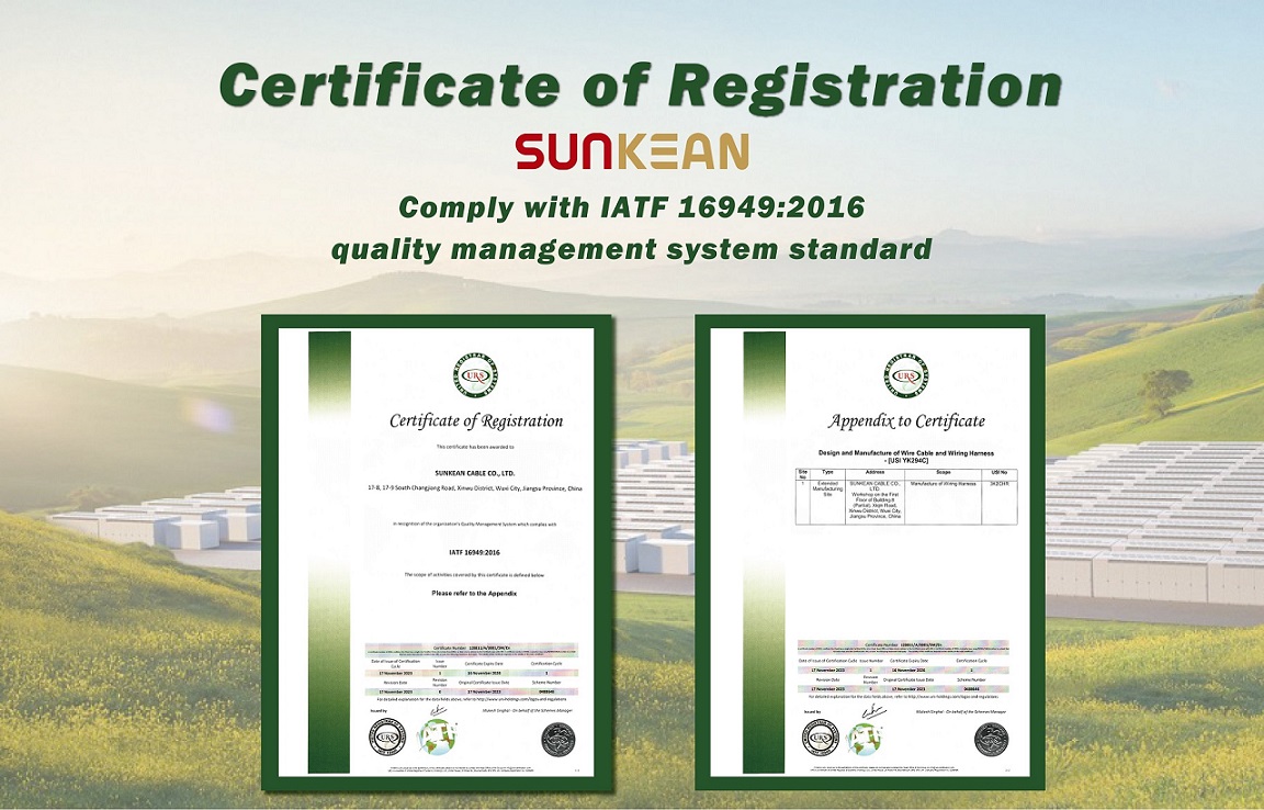 Die IATF16949- Zertifizierung ist ein Qualitätsmanagementsystemstandard, der von der International Automotive Task Force (IATF) entwickelt wurde und den höchsten Qualitätsstandard in der Automobilindustrie weltweit darstellt. Kurz nach dem Gewinn der weltweit ersten neuen Version des Energiespeicherkabel-Zertifikats des TÜV Rheinland gewann SUNKEAN die IATF16949- Zertifizierung und lief erneut aus dem „SUNKEAN Speed“ heraus.