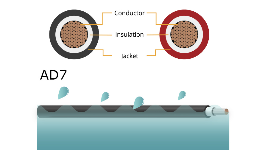 PV-Kabel mit der Schutzklasse AD7 halten kurzzeitigem Eintauchen in Wasser stand . Gemäß EN 50618 sind Solarkabel vom Typ H1Z2Z2-K bis zur Schutzklasse AD7, also gegen kurzzeitiges Untertauchen in Wasser, geschützt.